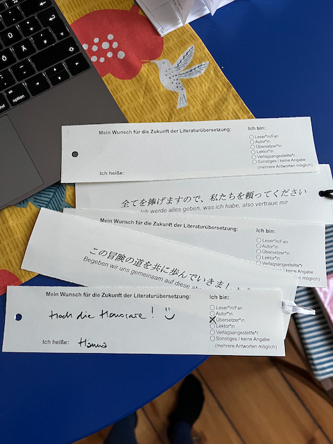 Wunschzettel (s. Foto unten) liegen vor Ort aus und können auch an vielen weiteren Stellen auf der Messe ausgefüllt werden. Alle - Kolleg*innen, Leser*innen, Autor*innen, Lektor*innen, Verlagsangestellte und wer sonst noch möchte - schreiben ihren Wunsch für die Zukunft der Literaturübersetzung auf und hängen ihn dann an den Wunschbaum, auf dass er prächtig gedeihe und zu einem echten Blickfang werde!