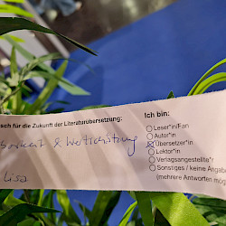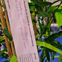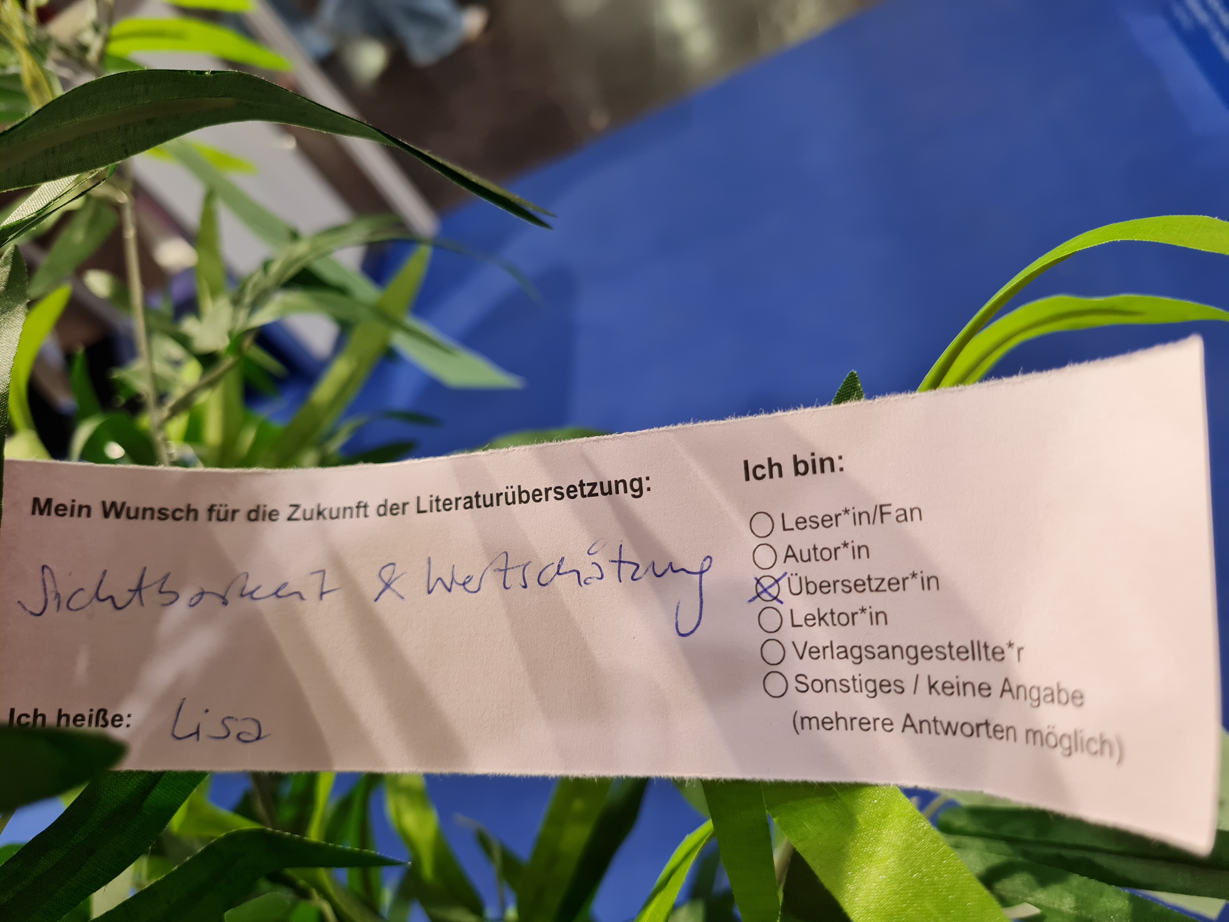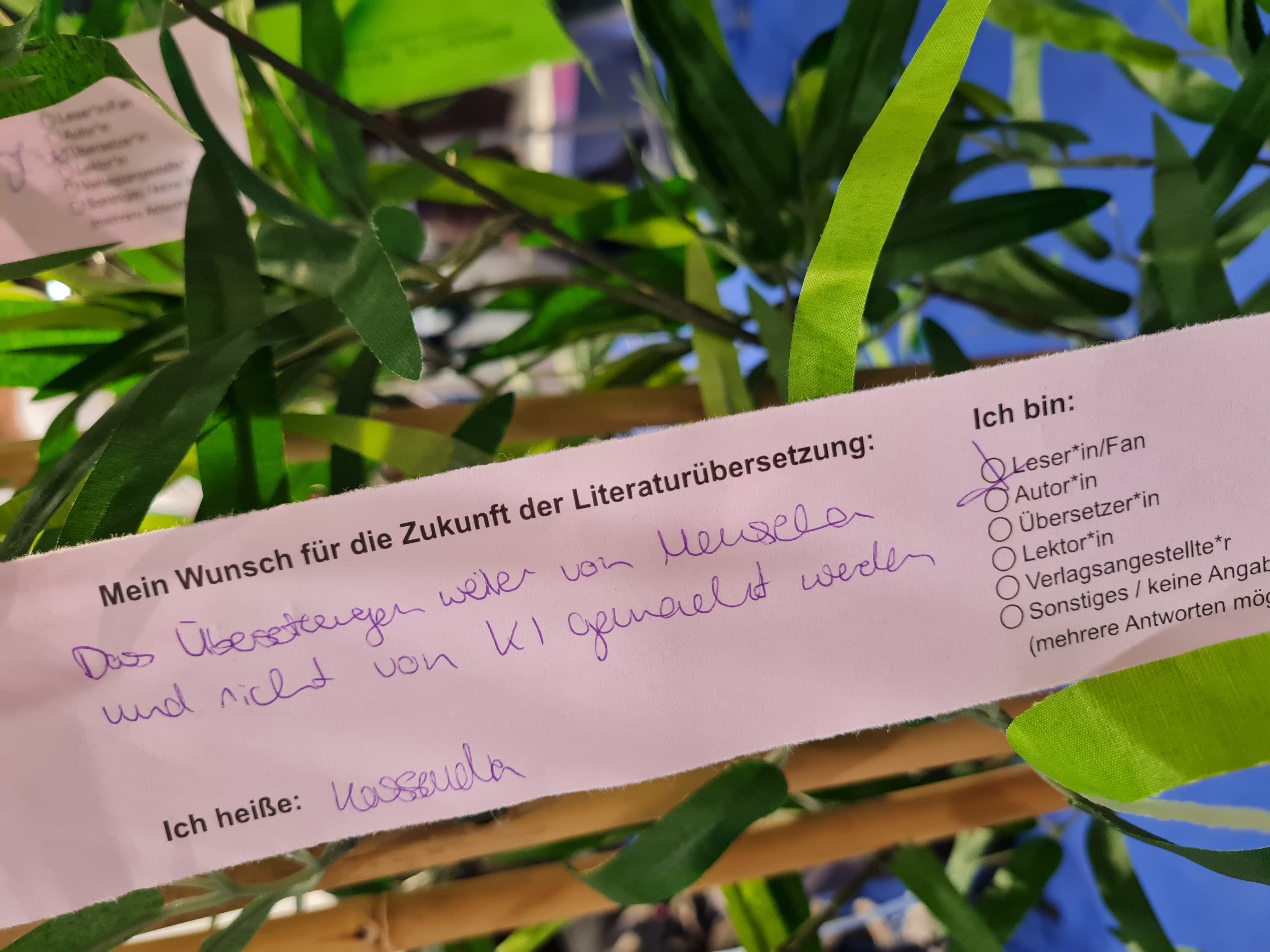 Wunschzettel liegen vor Ort aus und können auch an vielen weiteren Stellen auf der Messe ausgefüllt werden. Alle - Kolleg*innen, Leser*innen, Autor*innen, Lektor*innen, Verlagsangestellte und wer sonst noch möchte - schreiben ihren Wunsch für die Zukunft der Literaturübersetzung auf und hängen ihn dann an den Wunschbaum, auf dass er prächtig gedeihe und zu einem echten Blickfang werde!